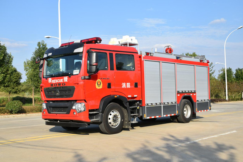 我公司生产的T5G单桥城市主战消防车采用中国重汽集团济南卡车股份有限公司生产的ZZ5207TXFV471GF5型二类汽车底盘, 该车原装双排驾驶室,可载含驾驶员在内的乘员6人,驾乘舒适轻便。该车采用DC-CAFS60/45M型集成压缩空气泡沫灭火系统,该压缩空气泡沫系统操控简易,泡沫生成实现即时全自动微机精确调控,并设多重保护与报警系统,消防作战员可依据复杂的火场情况,方便地借助按钮选择干泡沫、湿泡沫等不同类型的泡沫灭火方式。该套系统不仅装有A类泡沫原液,还装有B类泡沫原液,可高效率地扑灭和控制A、B类物质火灾,并具备良好的环保性能。另外该车配置有牵引电动绞盘,7.6米气动升降举升4*1000w照明灯和10.5kw车载发电机,使得该车还可独立开展侦查、破拆、救生、照明、防护等综合抢险救援功能。